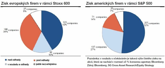 Evropské firmy reportovaly v 63 % případů čistý zisk lepší nebo v souladu s očekáváním, což odpovídá dlouhodobému průměru. Jde o lepší statistiku než v předešlých dvou kvartálech. Míra překvapení však byla nižší, než je historický průměr (a proto nelze výsledkovou sezónu považovat za spíše úspěšnou, ačkoli byly většinou překonány odhady trhu - pozn. red.). Zklamáním byly tržby firem, z nichž pouze 11 % předčilo konsenzus, což je nejhorší výsledek za několik let.