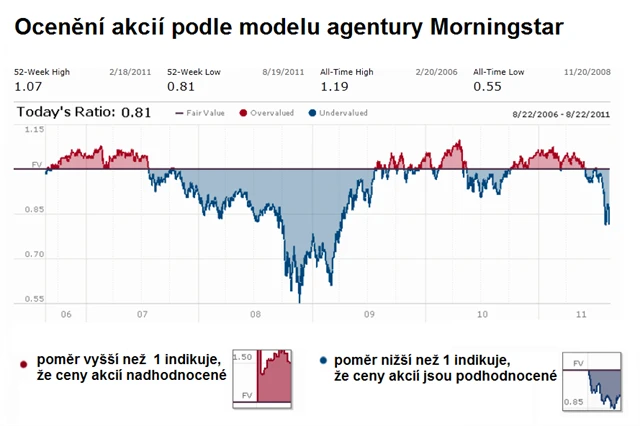 Nakoupit levně a prodat draze je přání každého investora. Indikátor nadhodnocených a podhodnocených akcí od renomované agentury Morningstar vám může hledání ulehčit. Aktuálně se zdají akcie podhodnocené (0,81) a v minulosti již dokázaly v těchto úrovních přilákat investory. Důležité je ale poznamenat, že akcie byly na přelomu let 2008 a 2009 ještě "podhodnocenější", než je investoři začali nakupovat (0,55).