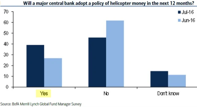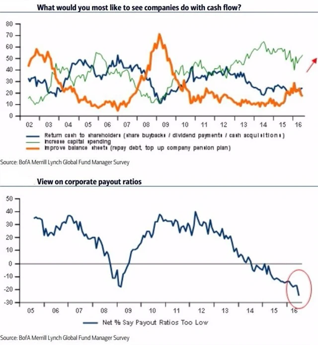 Grafy hovoří za vše. Manažeři by uvítali, kdyby firmy více myslely na budoucnost a investovaly namísto současného stavu, kdy štědře odměňují investory (kupují si je) vysokými dividendami a programy zpětných odkupů akcií. Pozice velkých fondů v hotovosti jsou relativně nejvyšší od roku 2001. Na druhou stranu stále více manažerů věří, že se centrální banky odhodlají k takzvanému shazování peněz z helikoptér, tedy de facto přímému posílání peněz firmám a spotřebitelům za účelem podpory spotřeby, inflace a ekonomiky.