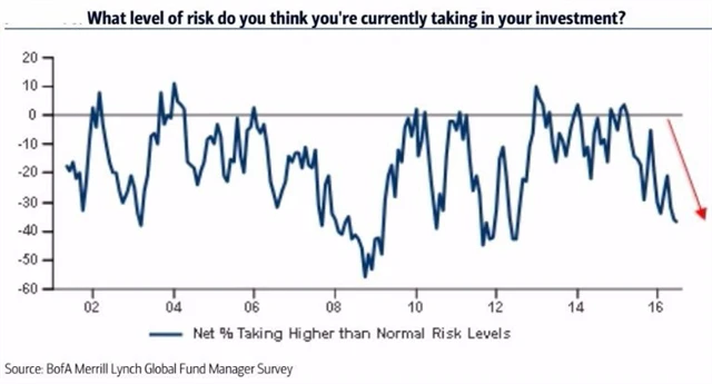 Bank of America Merrill Lynch každý měsíc provádí globální průzkum mezi manažery velkých investičních fondů. Jeho červencové vydání ukazuje na mnohé, určitě ale ne na jakoukoli ochotu více riskovat a propadat pocitu neohroženosti v době rally na americkém akciovém trhu, který prakticky denně posouvá historické rekordy.
