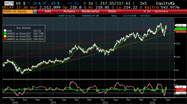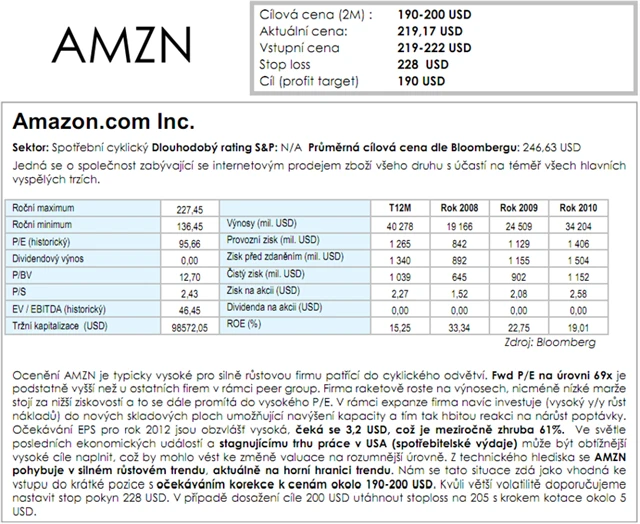 Společnost Amazon se zabývá internetovým prodejem zboží všeho druhu s účastí na téměř všech hlavních vyspělých trzích. Její akcie se pohybují v růstovém trendu, na jeho horní hranici. Očekávaná korekce vám může vydělat peníze - stačí spekulovat na pokles.
