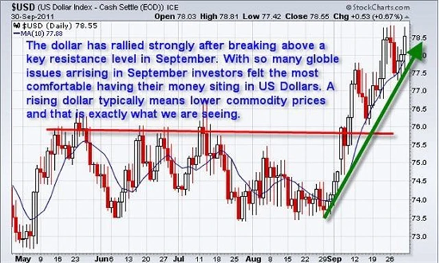 Americký dolar v září zahájil strmou rally. S rostoucí globální nervozitou se mnoho investorů rozhodlo právě pro americkou měnu, obzvlášť ve srovnání s eurem, jehož budoucnost je nejistá. Rostoucí dolar tlačí dolů ceny komodit.
