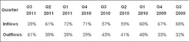 Z tabulky 1 je zřejmé, že ve 3Q jsme v případě 61 % všech hedgeových fondů byli svědky odlivu kapitálu.