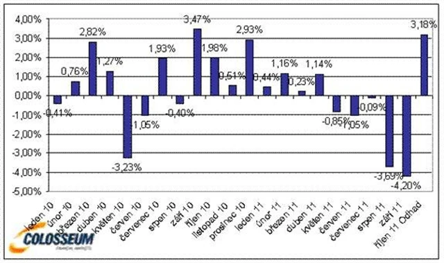 Z obrázku je zjevné, že se fondy potýkaly se ztrátami v období května až září, přičemž září bylo co do výkonnosti nejhorším měsícem od října 2008. Situace se zlepšila v říjnu, kdy se na finanční trhy dostavil optimismus a po prudkých výprodejích nastala korekce vzhůru. Říjnová data jsou zatím pouze odhadem. Od počátku roku dosahuje průměrná výkonnost všech hedge fondů (Barclay Hedge Fund Index) -3,89 %.