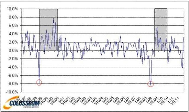 Na obrázku 2 je zachycena výkonnost hedgeových fondů v jednotlivých měsících od roku 1997. Je zjevné, že i v tomto případě se investorům vyplatí být kontrariány. Rozumný investor, který pečlivě vybral hedgeový fond, investiční strategii či jiný investiční program, vstupuje do nových pozic či přikupuje pozice v době, kdy nastaly poklesy. Statistiky ovšem naznačují, že většina investorů dělá pravý opak a nakupuje po prudkém růstu a několika měsících pozitivních výsledků.