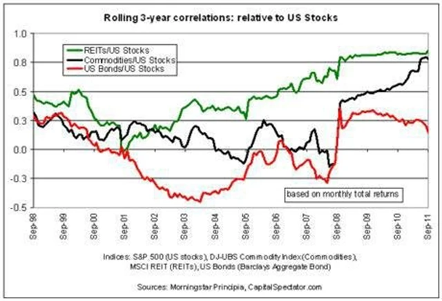 Korelace v posledních letech rostly rovněž u nemovitostních akcií (tzv. REITs - Real Estate Investments Trusts). Podobné výstupy získáme, když zkoumáme ve vzájemné souvislosti komodity a americké akcie.