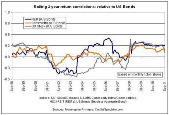 Podívejme se na skupiny aktiv poněkud odlišným způsobem a ověřme, jak americké vládní bondy korelují s nemovitostními akciemi REITs a komoditami. Korelace těchto párů jsou stále docela nízké. Obecně se pohybují okolo 0,3 nebo pod touto hodnotou, jak naznačuje následující graf.