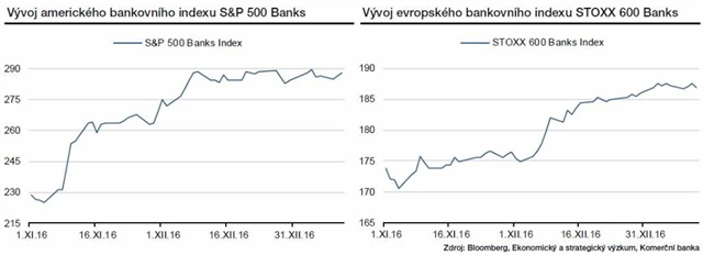 Neočekávané zvolení Donalda Trumpa americkým prezidentem přineslo impulz do vývoje akcií z bankovního sektoru. Plán na posílení fiskálních stimulů, snížení daní a uvolnění regulace zapůsobil jako živá voda na akcie bankovních domů jak v Americe, tak v Evropě. V prosinci pak rozhodnutí Fedu o zvýšení úrokových sazeb spolu s oznámením dalších tří očekávaných zvýšení během letošního roku dále posílily důvěru investorů v bankovní sektor.