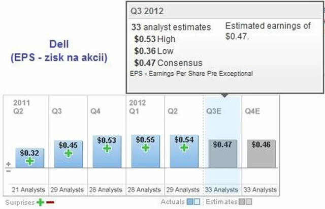 53,6 % analytiků hodnotí akcie Dell k nákupu, jde však o nižší hodnocení než u jeho 10 největších konkurentů, kteří hodnocení "koupit" získali v 68,8 %.