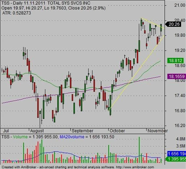 Akcie společnosti Total System Services se v posledních dnech odpoutaly od 200denního klouzavého průměru a nastoupily cestu vzhůru. Poslední dny nabídly konsolidační formaci vlajka s náznakem proražení. Pokud dojde v příštích dnech k pokračování růstu, pak lze vstoupit do pozice. Očekávaným cílem ve střednědobém horizontu je hranice 25 USD, což představuje zhodnocení přes 20 %. Samozřejmě je nutné aplikovat příslušná pravidla pro řízení rizika, zejména stop-loss.