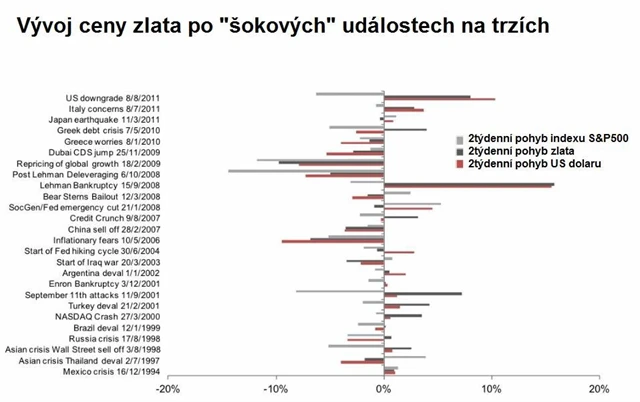 Po šokových událostech jde cena zlata prudce nahoru a pozitivní korelace s rizikovými akciemi rychle mizí.