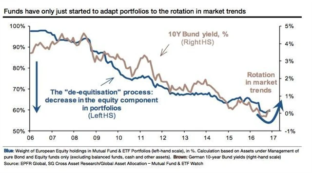 Investoři ale aktuálně přehodnocují své strategie. Výnosy dluhopisů začaly loni na konci roku přesvědčivěji růst, podle analýzy Société Générale je ale jejich vzestup teprve v rané fázi a manažeři velkých portfolií teprve přijdou s velkými změnami. Podle banky by přitom 10% převážení z dluhopisů do akcií znamenalo na globální úrovni přesun 2,3 bilionu USD.