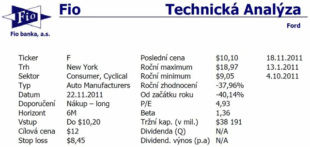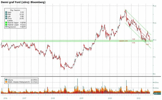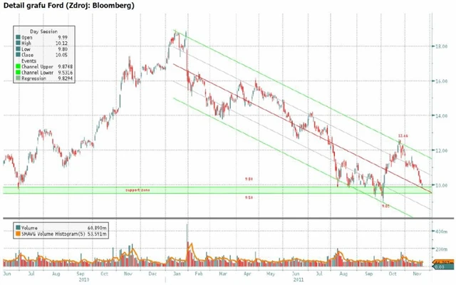 V případě překonání naznačeného klesajícího trendového kanálu, by pak mohl kurz akcií Ford vyšplhat až na 14 USD.