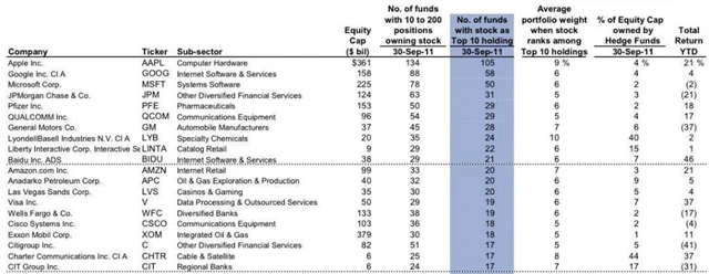 Akcie jsou seřazeny podle množství hedgeových fondů, které drží daný titul a v jejichž případě patří akcie mezi 10 největších pozic v portfoliu.