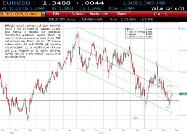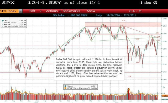 Index S&P 500 je pod hranicí 1 270 bodů (5. 12). První teoretickázáchytná meta byla 1250, která byla v pátek intradenně překonána, další případnou metou je právě 1 270. Po silně růstovém týdnu se otevřel prostor pro korekci. Americký dolar v páru s eurem reaguje na čísla z americké ekonomiky i na vývoj evropské dluhové krize. V uplynulém týdnu obrátil v souladu s obratem akciových a dostal se na rezistenci 1,3500. Tato hladina je prozatím jen krátkodobě překračována, aktuálně vypadá situace na reverzní obrat a návrat EUR pod prodejní tlak.