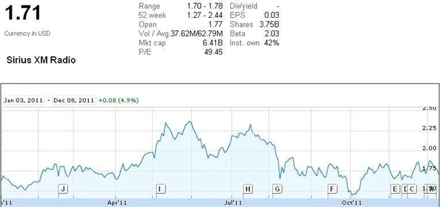 Jedná se o satelitní rádiovou společnost, který vznikla v roce 2007 sloučením firem Sirius a XM Radio. Akcie letos předvedly působivý růst, ani tak ovšem nemohou být investoři spokojeni, protože se akcie firmy po vrcholu na 2,44 USD za akcii propadly pod 2 dolary. Analytici doporučují tuto společnost k nákupu.