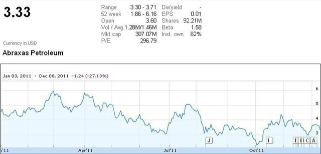 Firma se zabývá průzkumem a produkcí ropy a zemního plynu v Mexickém zálivu. Abraxas je menší firma než její nejbližší konkurence. TO je vidět i na letošní nižší produkci, a tedy i nižších tržbách. I tak 90 % analytiků doporučuje akcie firmy k nákupu s cílovou cenou 5,5 USD za akcii. Firma by měla v příštím roce těžit hlavně z větší expozice striktně na ropný průmysl.