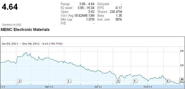 Firma vyrábí a dodává komponenty pro solární elektrárny. Stejně jako ostatní firmy z tohoto odvětví se letos i MEMC musela potýkat s převisem nabídky. To se samozřejmě promítlo do ceny akcií.