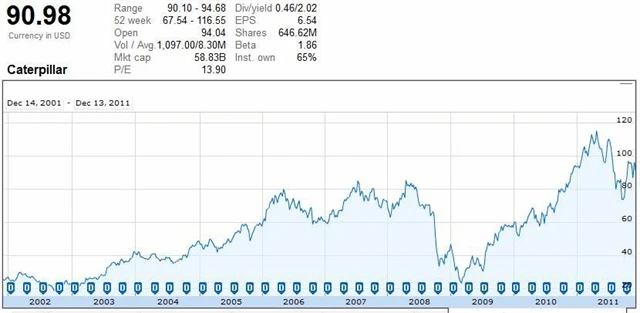 Podobně jako u McDonald's je těžké při současných cenách doporučovat akcii k nákupu. Během krize z let 2008 až 2009 dramaticky klesly zisky i cena akcií společnosti, takže investoři, kteří Caterpillar nakoupili na dně v březnu 2009, se nyní mohou pochlubit 300% zisky.