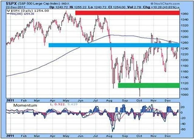 Klíčové střednědobé obchodní úrovně na S&P 500 indexu ukazuje graf za rok 2011. Tyto technické i sentiment úrovně budou velmi pravděpodobně obchodníky, a tedy i akciový index přitahovat a následně odrážet (zeleně support a červeně rezistence).