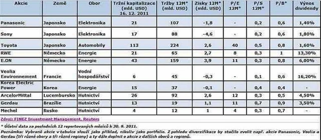 Hodně takových akcií byste našli v Japonsku, kde se po březnovém zemětřesení mnoho firem dostalo do ztráty, a navíc je dnes trápí silný kurz jenu, který brzdí japonské exporty. To vše v době, kdy japonské firmy musí bojovat se stále silnější konkurencí čínských výrobků. Mým favoritem jsou akcie firmy Panasonic, ale v podobné situaci jsou také Sony nebo Toyota.