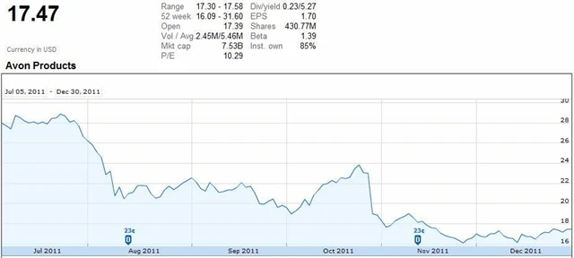 Avon byl nedávno analytiky označen za jednu z 5 nejhorších akcií spotřebitelského sektoru, která by však měla předvést nadprůměrnou výkonnost v roce 2012.