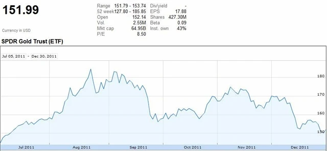 Zlatu se v prosinci vůbec nedařilo, proto i akcie SPDR Gold Trust ETF ztratily více než 10 %. Po měsíce bylo zlato investory vyhledáváno jako bezpečná investice. Vzhledem ke strachu z dopadů amerického kvantitativního uvolňování jej preferovali před americkými státními dluhopisy. To se však změnilo, když Fed v září oznámil Operaci Twist a nadále zastává spíše odmítavý postoj k dalšímu možnému "tištění peněz".