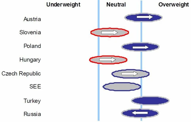 Rusko – neutrální až převážit Rusko zůstává obtížným tématem. Model doporučuje převážit, především na základě ocenění a ziskovosti. Při zohlednění nejistého výhledu ceny ropy (která se stále ještě pohybuje velmi vysoko, ale nevykazuje silnou dynamiku) upravují analytici své doporučení z "převážit" na "neutrální".