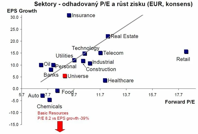 Téměř všechny sektory již hlásí zlepšení ohledně revize odhadu zisků. Obavy z recese, či přinejmenším z poklesu míry růstu, mají dozajista tlumící vliv na základní suroviny, jakož i na ropu a plyn.