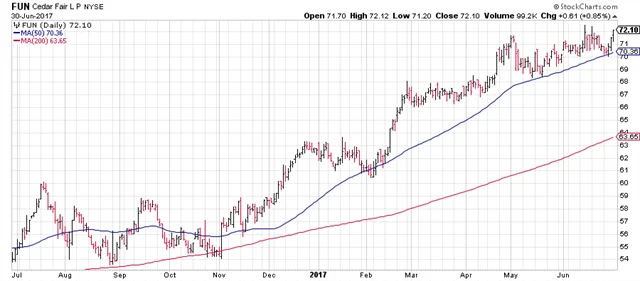 Cedar Fair provozuje 11 zábavních parků, 3 vodní parky a 5 hotelů v USA a Kanadě. Akcie firmy sice nejsou levné (P/E 25,2), ale nabízejí stabilní růst a zajímavou dividendu, která rovněž stabilně roste (dividendový výnos 4,7 %). Problémem může být vysoký dividendový výplatní poměr 117,89 %. Analytik z Goldman Sachs Christopher Prykull drží cílovou cenu 81 USD.