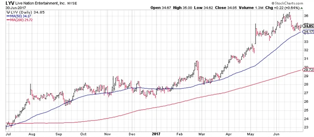 Live Nation je promotér koncertů, působí v oblastech prodeje vstupenek, reklamy, managementu a sponzoringu. Společnost má za sebou dvě ztrátová čtvrtletí, očekávání analytiků ale překonala a má podle nich před sebou dobré období. Stále více kapel vyjíždí na turné, která jsou v době poklesu tržeb za prodej nosičů stále podstatnějším zdrojem příjmů hudebníků. Růst cen vstupenek mladým lidem evidentně nevadí. P/E je kvůli ztrátám trochu problém (forwardové P/E 85), firma nevyplácí dividendu, ale cena akcií v posledních letech stabilně roste.