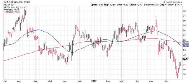 TJX Companies působí v oblasti prodeje oblečení a domácího vybavení a je jednou z firem se starým obchodním modelem, které dokáží vzdorovat Amazonu a zaznamenávat dlouhodobý růst tržeb. Pomáhá jí v tom cenová politika, která ukazuje, že nízké ceny mohou být cestou k zisku. Akcie klesly za poslední dva měsíce o 14 %, což pro hodnotové investory může být signál ke vstupu. P/E je celkem rozumných 20,5 a dividendový výnos činí 1,5 % při výplatním poměru 29,55 %.