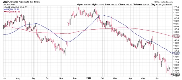 Advance Auto Parts působí v oblasti prodeje součástek a doplňků do automobilů. Přestože se firmě v posledních dvou čtvrtletích nepodařilo naplnit zisková očekávání analytiků, zisk roste a akcie jsou v hledáčku investorů. Důvodem může být i pokles ceny z prosincového maxima, na současném trhu není nad nákup ve slevě. Firma prochází restrukturalizací s cílem snížit náklady a zefektivnit distribuci a nedávno propustila 500 lidí. P/E je 21,1 a dividenda stabilní, byť velice nízká (výnos 0,2 %, výplatní poměr 4,35 %).