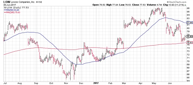 Lowe's Companies je prodejce potřeb pro rekonstrukce domů a stavebnictví obecně a působí v USA, Kanadě a Mexiku. Cena akcií je v posledním roce jako na houpačce a stejně tak i zisky, které po poklesu na konci roku 2016 a v 1Q2017 začínají opět růst. Firma nedávno dokončila akvizici společnosti Maintenance Supply Headquarters za 512 milionů dolarů a bude se více orientovat na profesionální klienty, což je dlouhodobě pozitivní zpráva. P/E je 24,3 a dividenda v posledních letech stabilně roste (výnos 2,15 %, výplatní poměr 43,89 %).