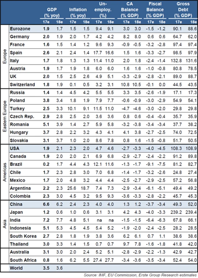 Americký HDP by po zpomalení v prvním čtvrtletí měl pokračovat v silnějším růstu, ovšem zatímco průmysl by mohl sílit, kondice spotřebitelů zřejmě zůstane letos lehce omezená. HDP by měl růst zhruba o 2 %. V eurozóně se snížila míra politického rizika díky vývoji ve Francii a ekonomika by mohla postupně zrychlovat až k bezmála 2% růstu. HDP by měl být vedle osobní spotřeby podporován také investičními výdaji. Inflace v evropské měnové unii by ale i v důsledku cen ropy neměla výrazněji růst, pro letošní rok Erste čeká 1,5 % a jádrovou inflaci 1 %.