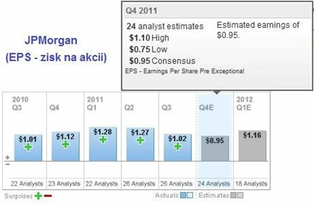 Analytici predikují u JPMorgan 15% pokles zisku oproti stejnému období loňského roku na 95 centů na akcii. Taktéž u tržeb je očekáván meziročně pokles. Za čtvrté čtvrtletí minulého roku vykázala banka tržby ve výši 26,7 miliardy USD, letos by měly klesnout o téměř 14 % na 23 miliard.