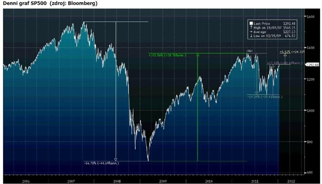 Zatímco index DAX propadl až k poslední technické podpoře u 5 000 bodů, která byla poslední významnou záchytnou stanicí, než by se index sesunul až na dno krize 2008, index S&P 500 se zastavil už u hranice 1 100 bodů. Z pohledu stejného místa na grafu by podpora 5 000 na indexu DAX odpovídala podpoře 950 bodů na indexu S&P 500. To je poměrně slušný rozdíl.