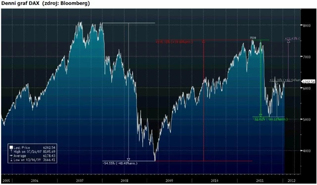 Rozdíl začíná být patrný v poklesu, který přišel v roce 2011. DAX se propadl z maxima 7 530 bodů o zhruba 32 %, zatímco index S&P 500 poklesl "jen" o necelých 20 %. Takovýto údaj není samozřejmě překvapující; potvrzuje, že pokles v roce 2011 je otázkou Evropy.