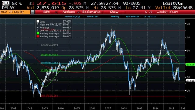 Společnost Metro AG provozuje maloobchodní prodejny a své produkty nabízí také přes internet. Firma působí po celé Evropě, v Asii a Africe. Akcie firmy se pohybují na ročních minimech, když sletěly z úrovní okolo 60 eur. Hlavním důvodem byla eskalace rizikové averze v reakci na probíhající dluhové obavy v Evropě. Nicméně to lze brát hlavně pozitivně, protože ocenění na úrovni historického P/E se snížilo z vysokých 20 na současných 10. Očekávané P/E pro rok 2012 je na solidních 8,94, což je absolutně nejlepší ocenění v rámci sektoru.
