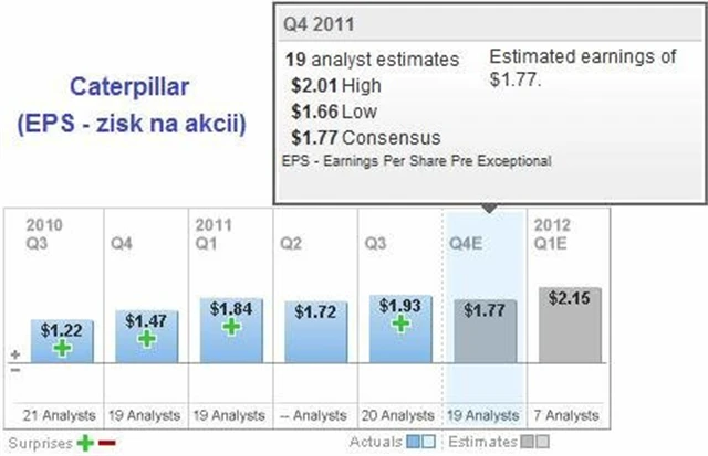 Podle analytiků by Caterpillar mohl reportovat zisk 1,77 USD na akcii v porovnání s loňskými 1,47 USD. Tržby by se měly vyšplhat na 16 miliard USD oproti 12,8 miliardy USD ve stejném období před rokem.