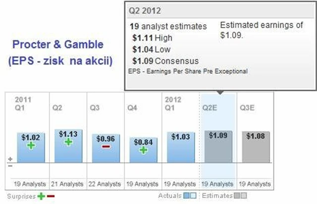 Společnosti Procter & Gamble nejspíš zisk poklesne o 3,5 % z 1,13 USD na akcii na 1,09 USD. Tržby by podle predikcí měly meziročně růst o 1 miliardu na 22,3 milardy USD.