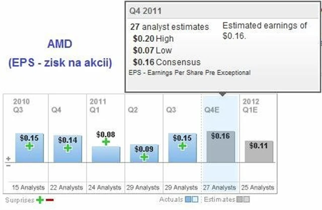 AMD čeká pravděpodobně meziroční růst zisku o 14 % na 16 centů na akcii. Čtvrtletní tržby by mohly meziročně růst z 1,6 miliardy na 1,7 miliardy USD.