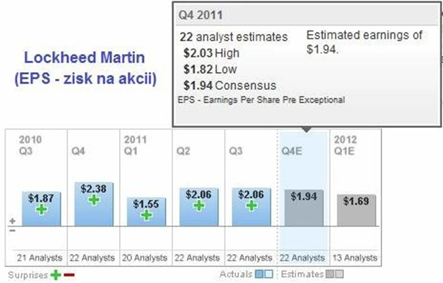 Odhady analytiků překonal Lockheed Martin pokaždé v posledních 12 čtvrtletích. její akcie jsou oblíbené i mezi hedgeovými fondy, které drží akcie za zhruba 900 milionů dolarů.