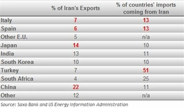 Jakýkoli konflikt zvedá ceny černého zlata, což by mělo pomoci těžařům ropy po celém světě. Dodatečně by integrované ropné společnosti měly být schopny vyšší cenu ropy, kterou vytěží, přenést na koncové zákazníky. Těžaři ropy v regionech, které zasáhne íránské ropné embargo, z toho budou profitovat jako první, protože růst poptávky po jejich produktech zvedne cenu ropy, kterou jim platí rafinérie. Kterých zemí se ropný obchod s Íránem nejvíce týká?