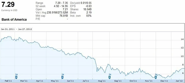 Bank of America je druhou největší americkou bankou a finančním holdingem s aktivy v hodnotě více než 2,2 bilionu USD. Před dvěma lety, když se její akcie obchodovaly za 15,50 USD, nakoupil její akcie John Paulson a predikoval do konce roku 2011 růst na 30 USD. Akcie se ovšem vydaly opačným směrem a 19. prosince spadly na dvouletá minima kolem 5 USD za akcii. Nepomohli jim ani akcionáři formátu Paulsona nebo Buffetta.
