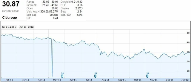 Citigroup je vedle BoA hlavním favoritem. Očekává se, že její zisk poroste v budoucích pěti letech 9% ročním tempem. Akcie banky ztratily v posledním roce 45 % své hodnoty. S&P dala bance honocení "držet" s dvanáctiměsíčním cílem 35 USD. Od Thomson Reuters obdržela známku 4.