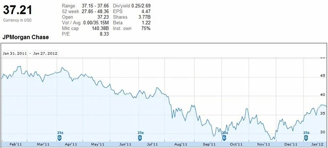 JPMorgan je finanční holding zabývající se komerčním a investičním bankovnictvím (dceřiné společnosti se specializují i na další finanční oblasti). V roce 2011 akcie ztratily zhruba 20 %. S&P doporučuje akcie držet a očekává, že dosáhnou do 12 měsíců 36 USD. Thomson Reuters hodnotí akcie JPMorgan pozitivně - známkou 10.
