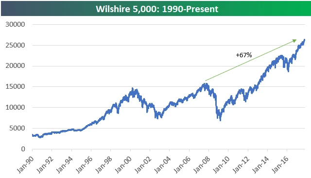 Nelze nezačít zmíněným trhem v USA, který se na světové tržní kapitalizaci veřejně obchodovaných firem i váhově na globálních indexech podílí stále největší měrou. Index S&P 500 od maxima dosaženého v roce 2007 posílil do současnosti o více než 60 % (na grafu je 62 %, ale jde o graf den nebo dva starý), index Wilshire 5000 hlásí za deset let zhodnocení dokonce o 67 % (jde o vážený index všech v USA obchodovaných akcií, které stojí za řeč).