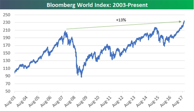 Globální akcie jako celek na tom nejsou ani zdaleka tak slavně, a to navzdory již vzpomínané velké váze amerického trhu. Bloomberg World Index od vrcholu býčího trendu z roku 2007 přidává jen 13 %