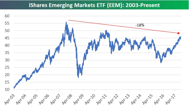 No a mladé trhy, zdá se, po finanční krizi přepálily start a aktuálně ještě ani nedorovnaly maxima z roku 2011, natož rekordy z doby před krizí. Na ty ztrácejí 18 %(ETF je obchodovaný v dolarech - pozn. red.).